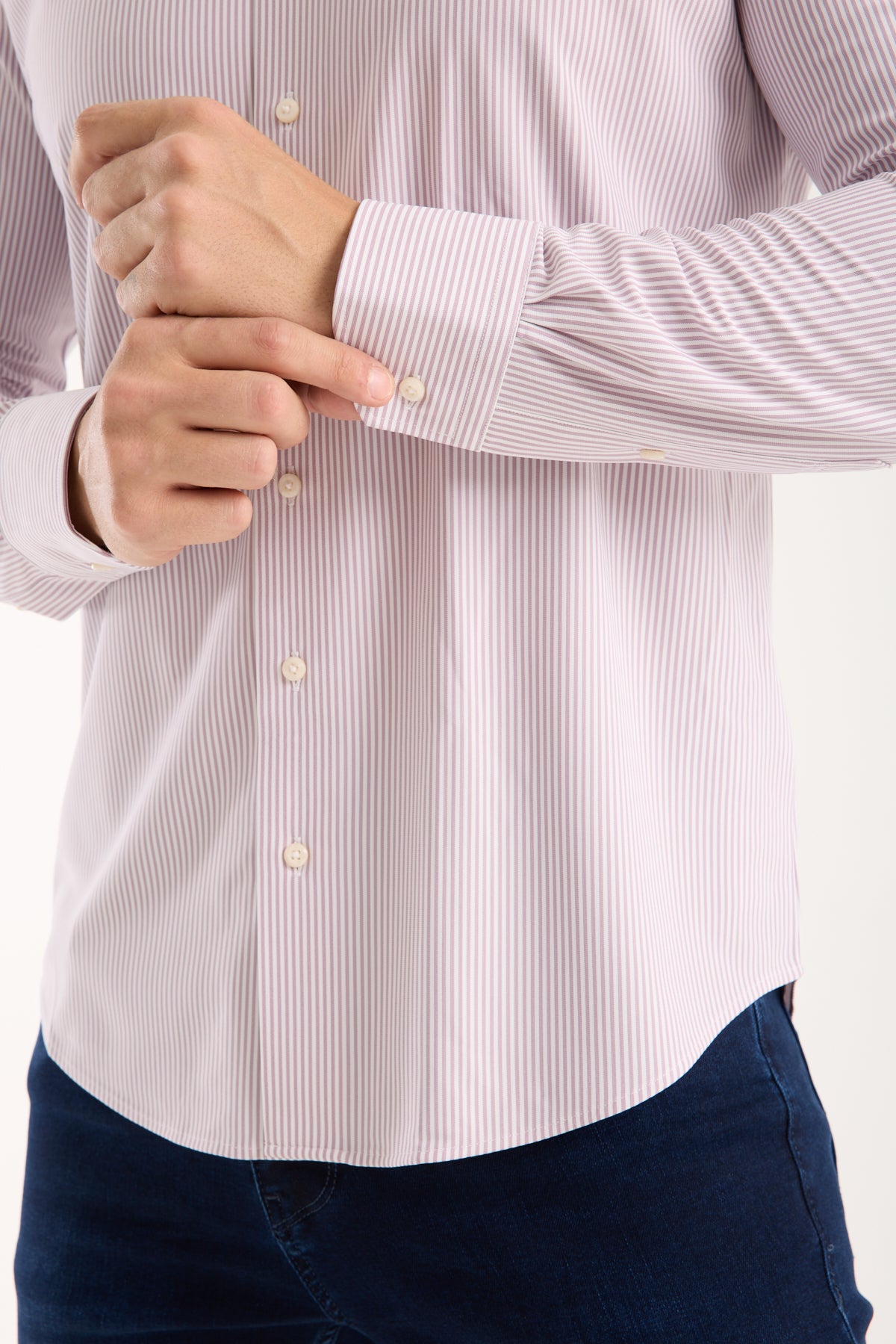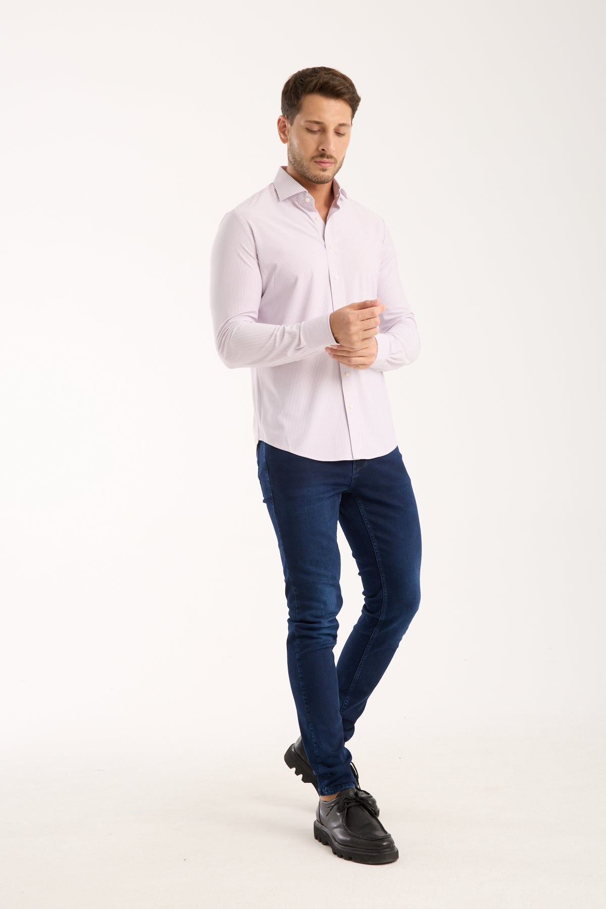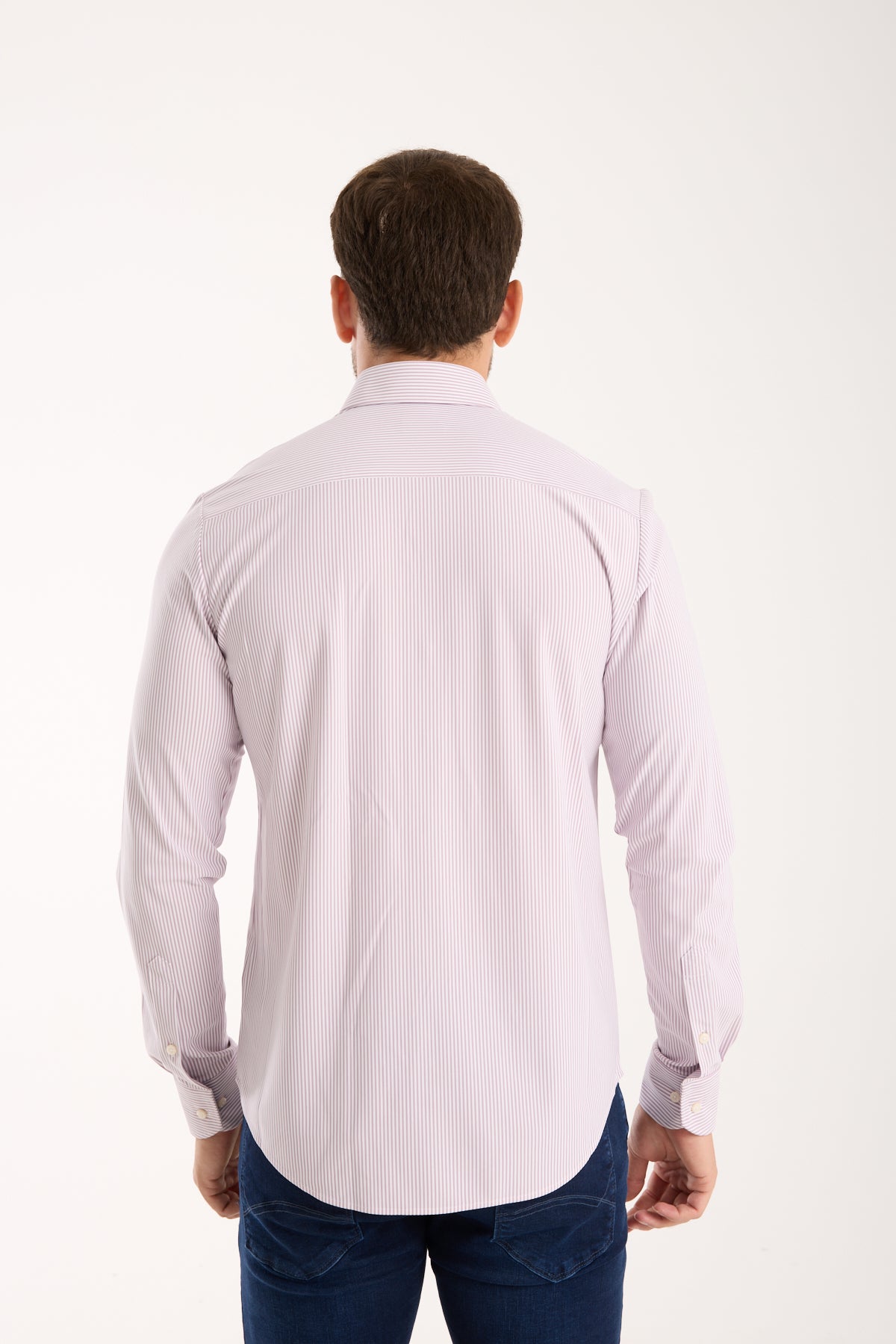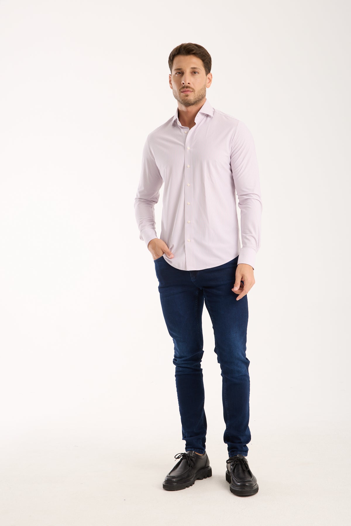 This shirt boasts a stylish French collar and a contemporary slim fit that accentuates your physique while providing maximum comfort. The long sleeves add sophistication, and the light purple stripe pattern brings a touch of uniqueness. Made for men who appreciate quality and style, this shirt is perfect for various occasions.