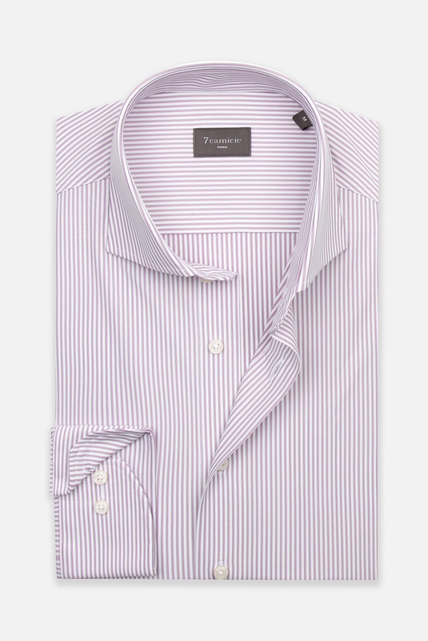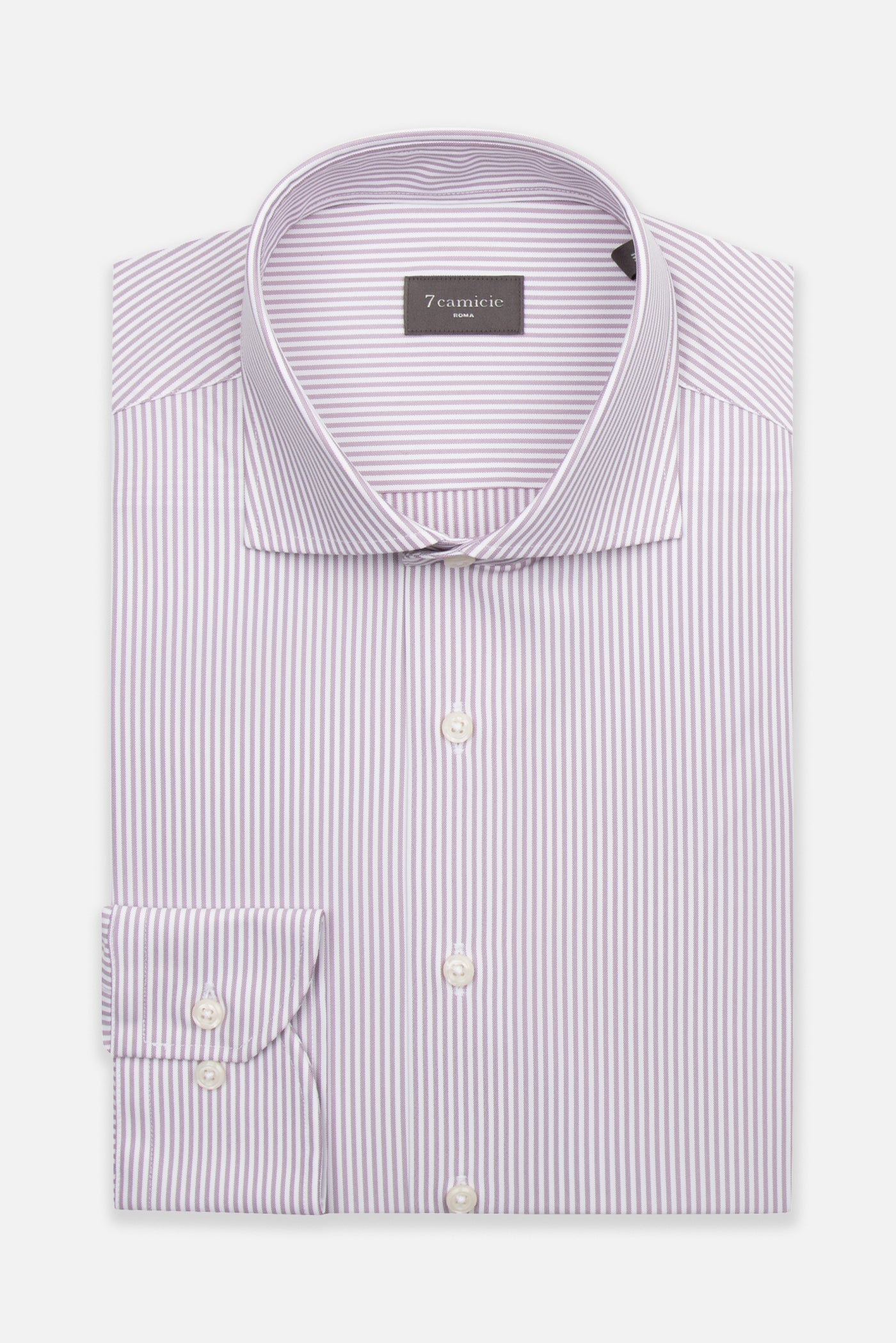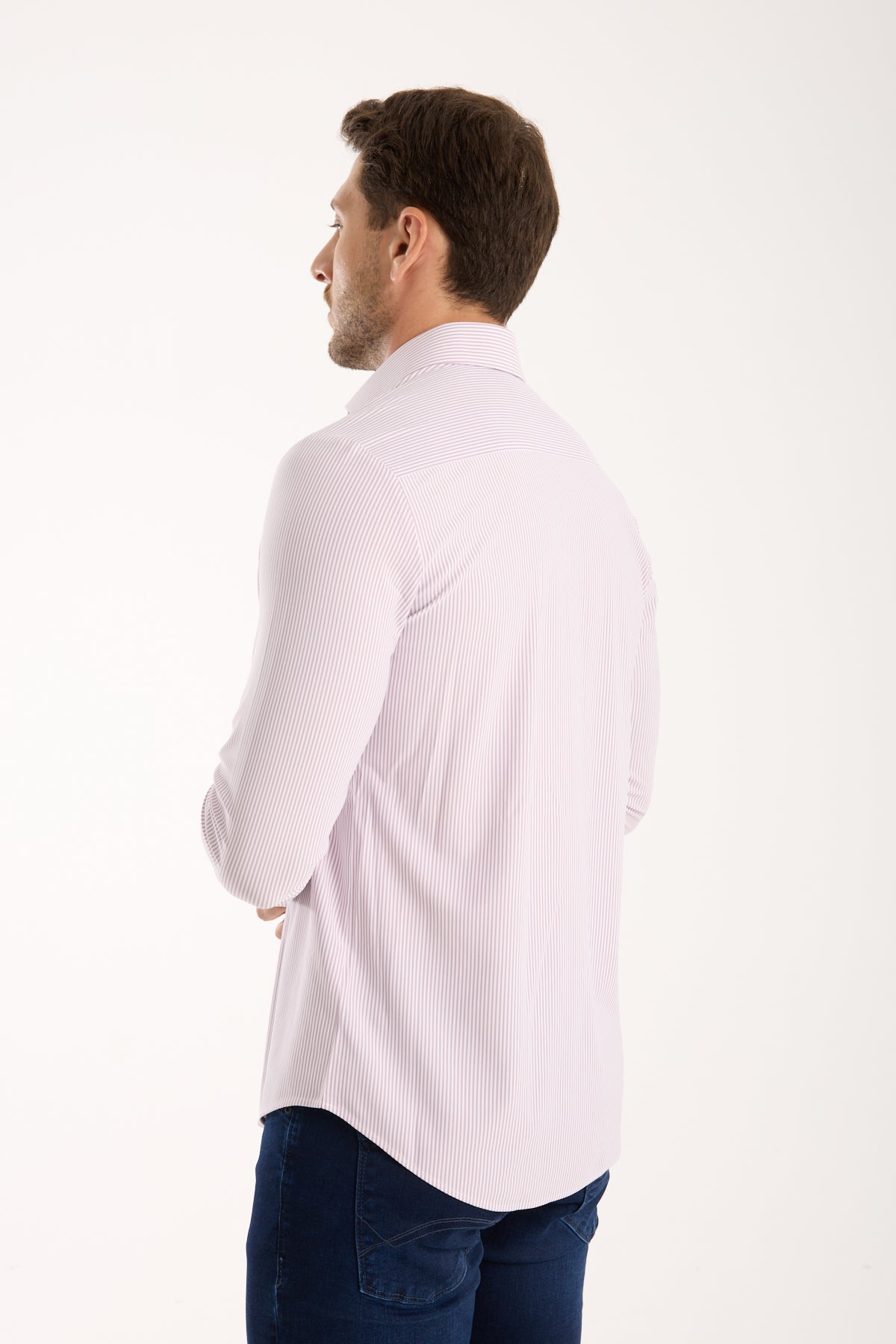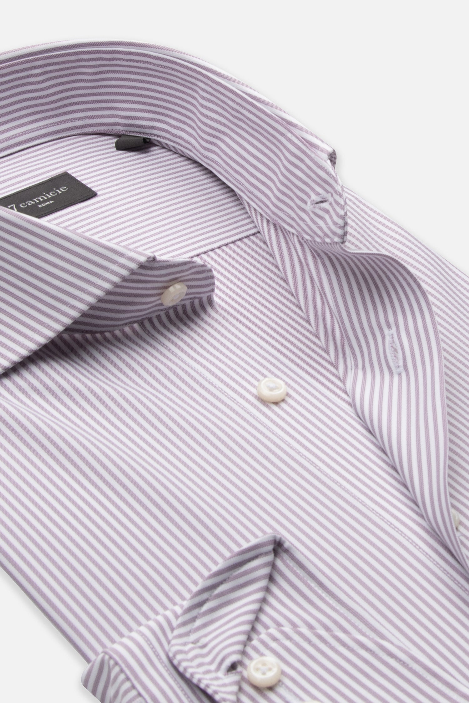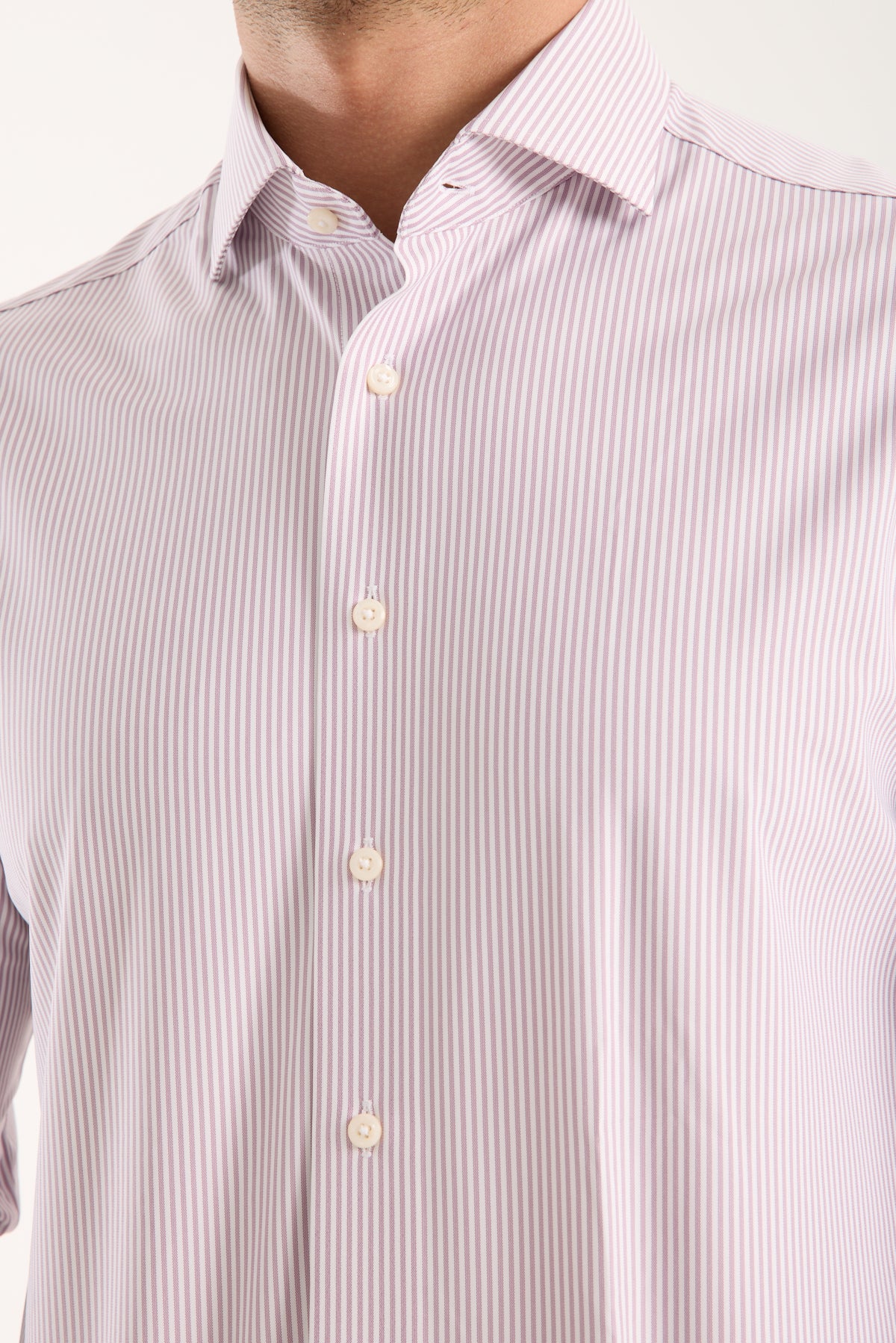 This shirt boasts a stylish French collar and a contemporary slim fit that accentuates your physique while providing maximum comfort. The long sleeves add sophistication, and the light purple stripe pattern brings a touch of uniqueness. Made for men who appreciate quality and style, this shirt is perfect for various occasions.