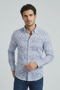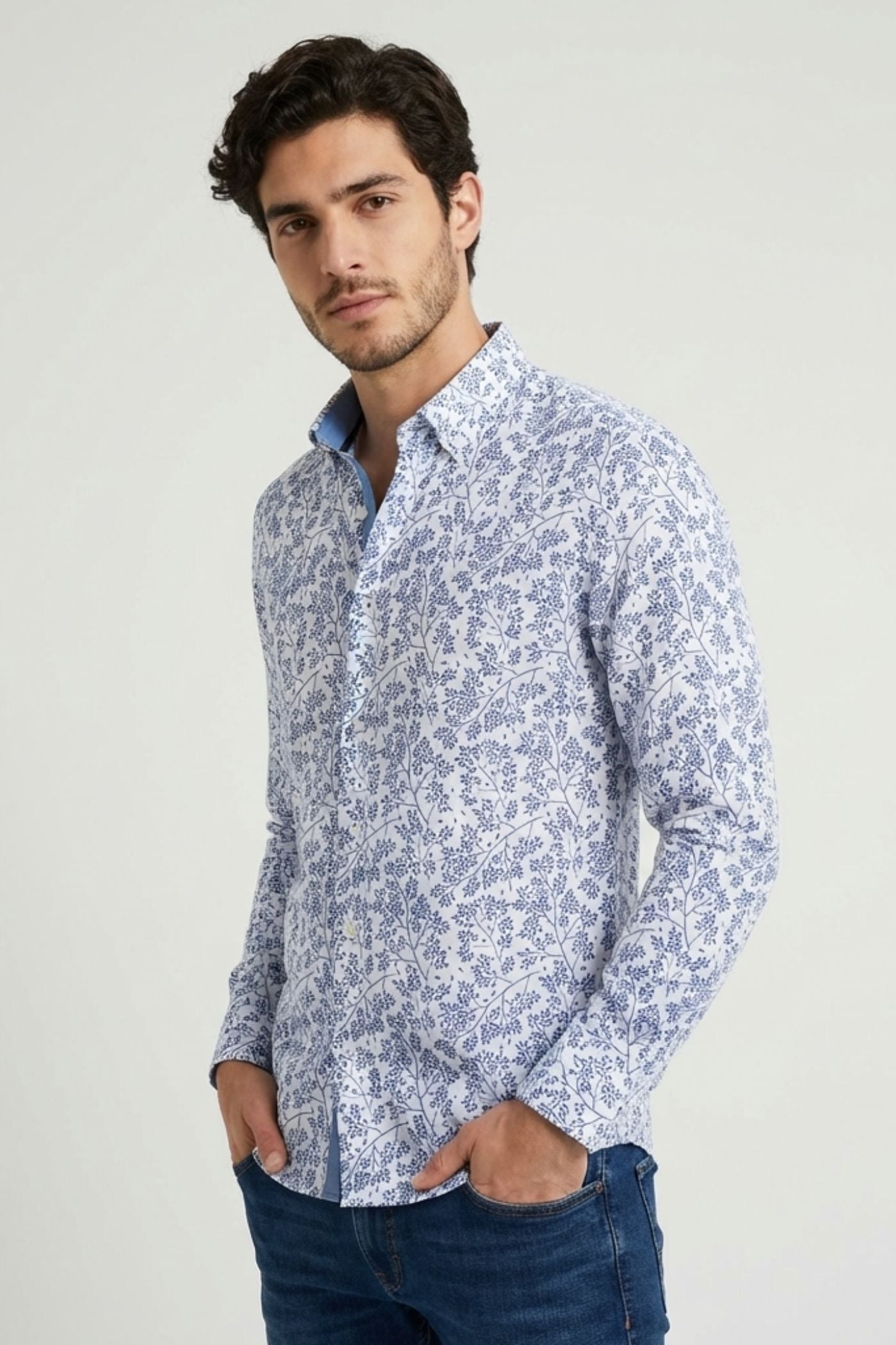 This versatile shirt comes with a slim fit silhouette that flatters your physique while ensuring maximum comfort. The contrasting inner collar and cuffs provide a stylish accent that enhances the overall look. Available in a refreshing blue floral pattern, this shirt will brighten up any outfit. Perfect for all seasons, its lightweight fabric keeps you cool, making it a staple in your wardrobe.