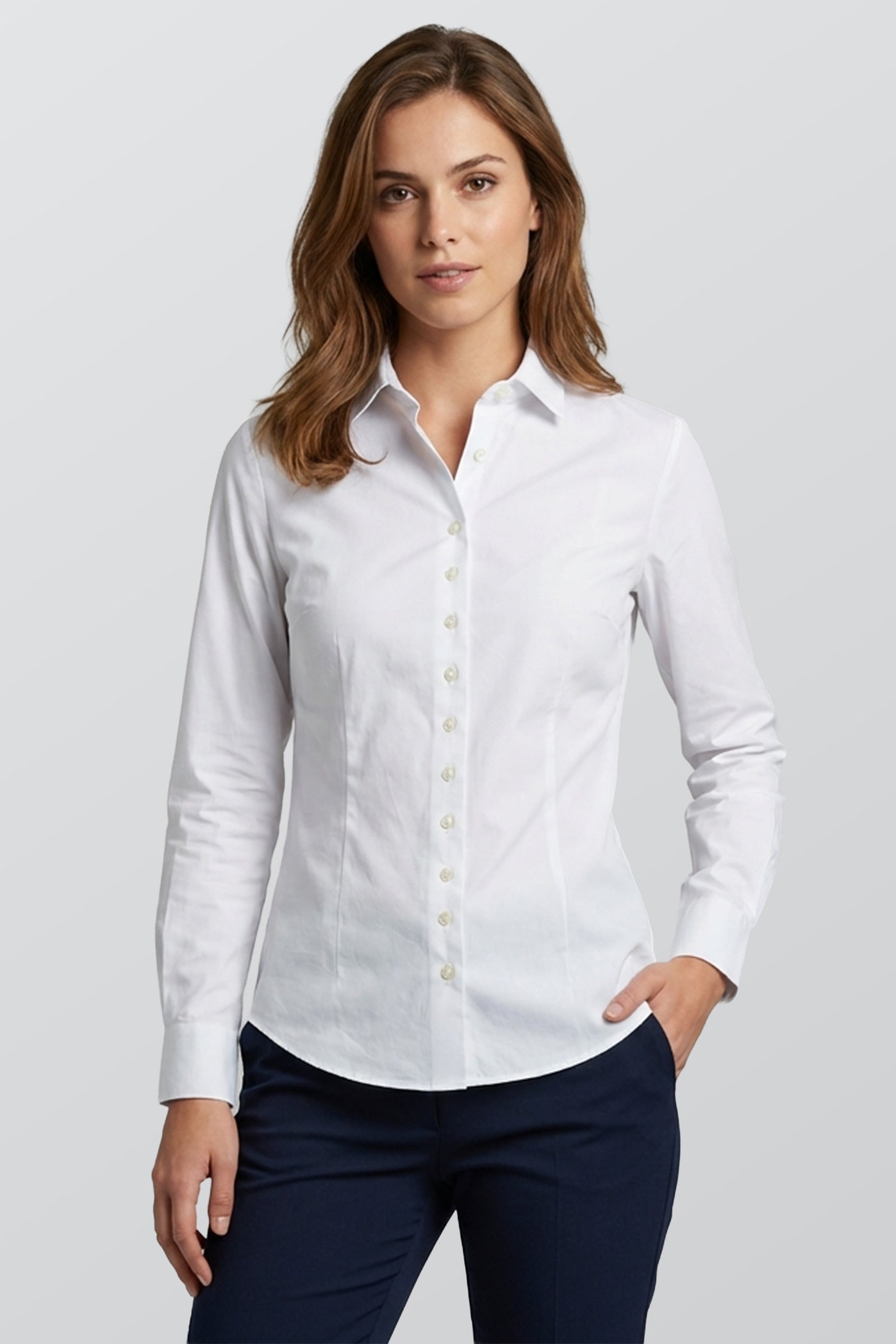 Klassischer Stil: Die Linda Damenbluse mit italienischem Kragen aus weißem Stretch-Popeline verkörpert zeitlose Eleganz und Raffinesse.