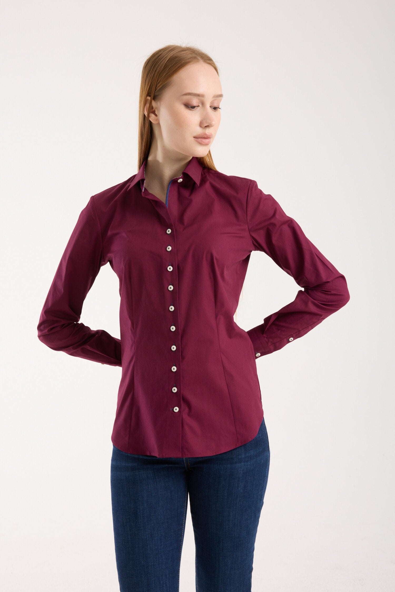 Entdecken Sie unser stilvolles Damenhemd mit italienischem Kragen, das ideal für sportliche Anlesse ist. Dieses Hemd in einem eleganten Bordeaux-Ton ist aus hochwertigem Popeline-Stretchstoff gefertigt, der sowohl Komfort als auch Bewegungsfreiheit bietet. Die langermelige Passform unterstreicht die feminine Silhouette, wehrend das schlichte Design für Vielseitigkeit sorgt. Das Hemd passt perfekt zu Jeans oder eleganten Hosen und ist ein Must-Have in jeder Garderobe.