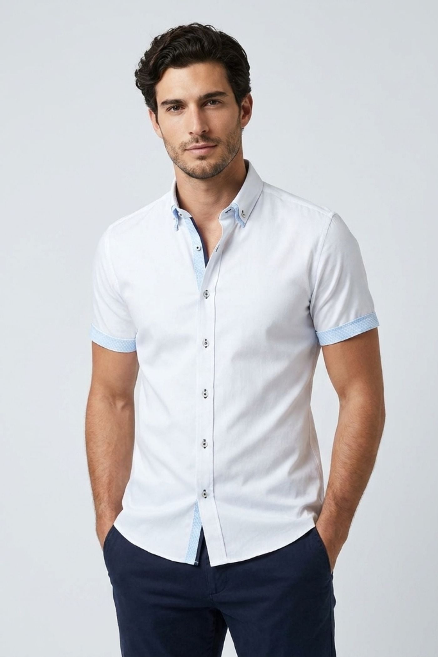 Descripción del Producto: Nuestra camisa de hombre con cuello botón es la elección perfecta para quienes buscan un look elegante y contemporáneo. Con su corte slim fit y mangas cortas, esta camisa está diseóada para resaltar tu silueta de manera cómoda y estilizada. El color blanco puro combina a la perfección con el distintivo diseóo interior en azul claro, haciendo de esta prenda una opción ideal tanto para el día como para la noche. Elaborada en tela Poplin Stretch, ofrece una gran transpirabilidad y libertad de movimiento, convirtiéndola en una pieza versátil en cualquier guardarropa.