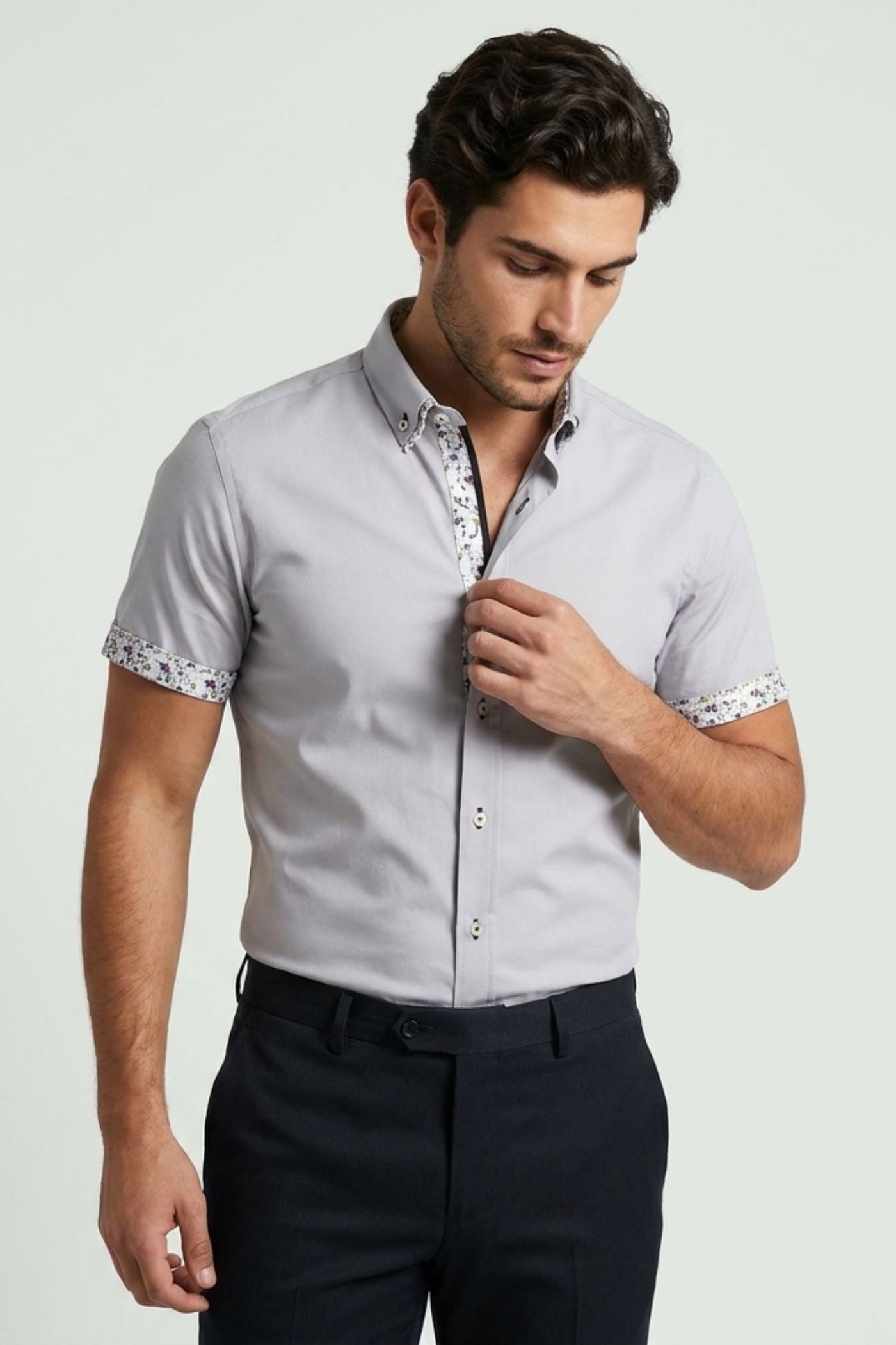 Nuestra camisa para hombre es una elección acertada para quienes valoran la moda y la funcionalidad. Su ajuste slim fit resalta la figura, mientras que las mangas cortas garantizan frescura en los días cálidos. Disponible en un elegante color gris, el contraste floral en el interior del colletto aóade un detalle distintivo. Esta camisa es perfecta para cualquier evento o para el uso diario, convirtiéndola en una prenda versátil.