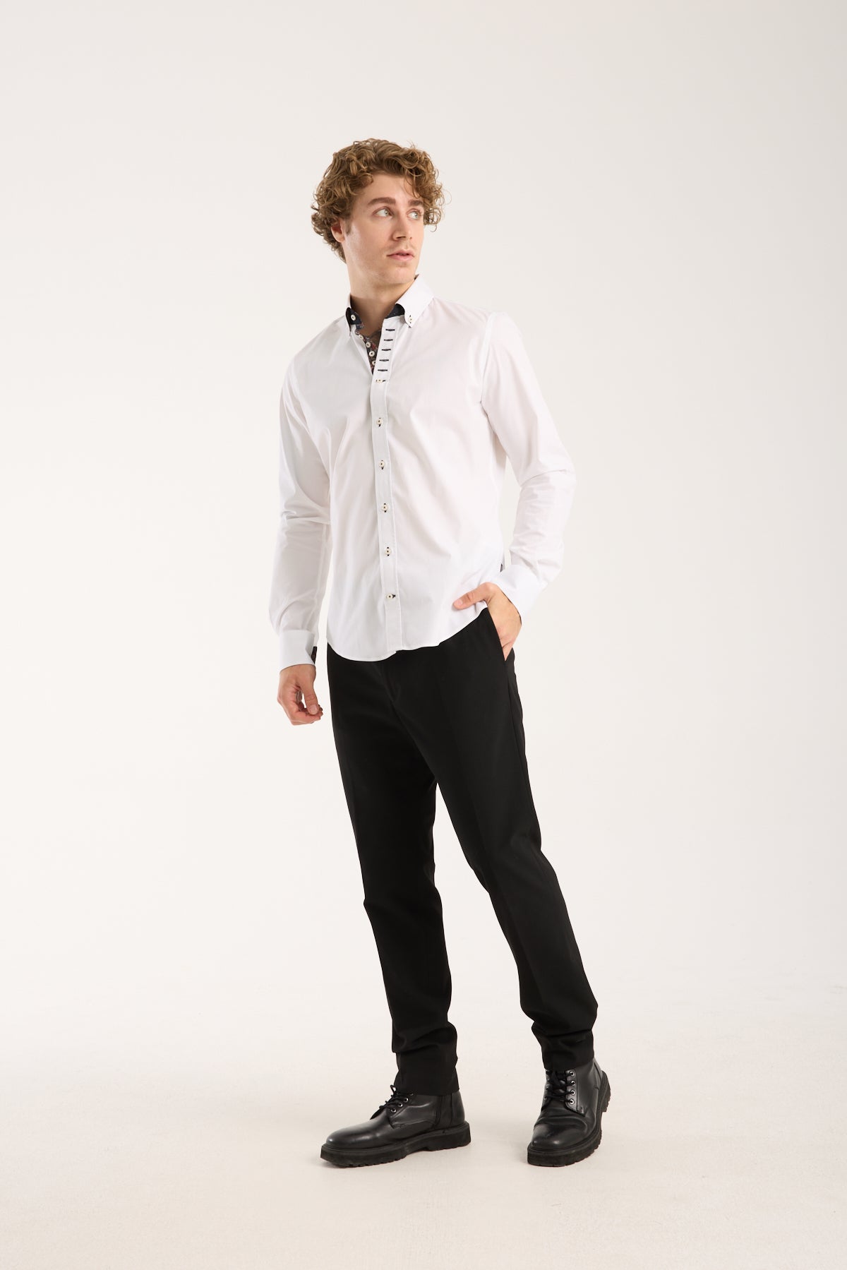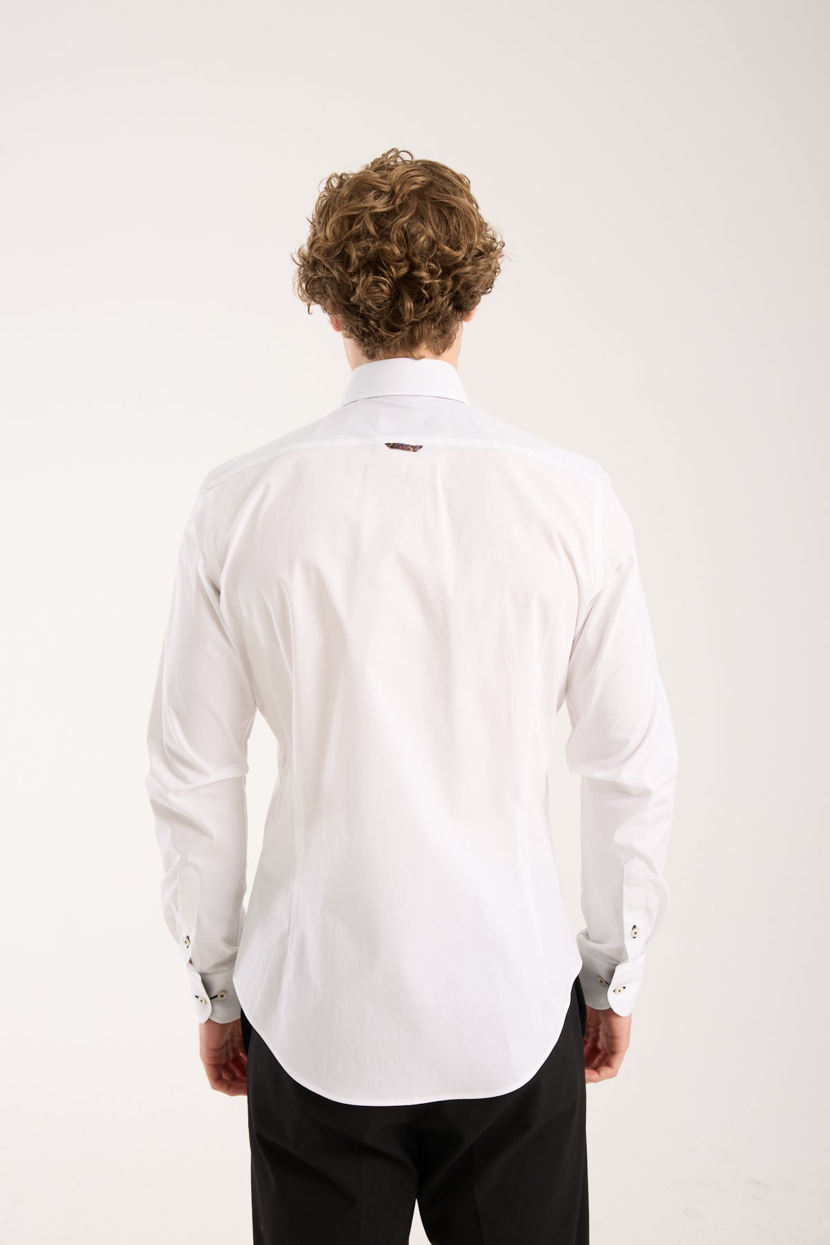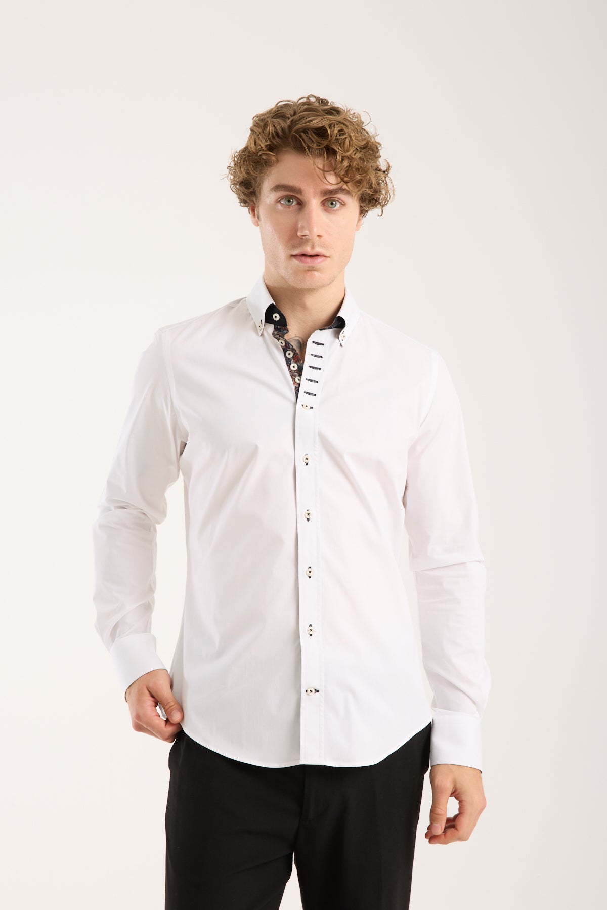 Presentamos nuestra camisa para hombre de ajuste slim, diseóada para resaltar tu figura con elegancia y confort. Esta prenda incluye un cuello abotonado que le da un toque clásico y sofisticado. Con mangas largas y un patrón liso, es ideal para cualquier ocasión, desde un día en la oficina hasta una cena elegante. Fabricada con t tejido popelín elástico, ofrece una sensación suave al tacto y libertad de movimiento. Su color blanco puro contrasta magistralmente con el distintivo interior del cuello, creando un estilo realmente ónico.