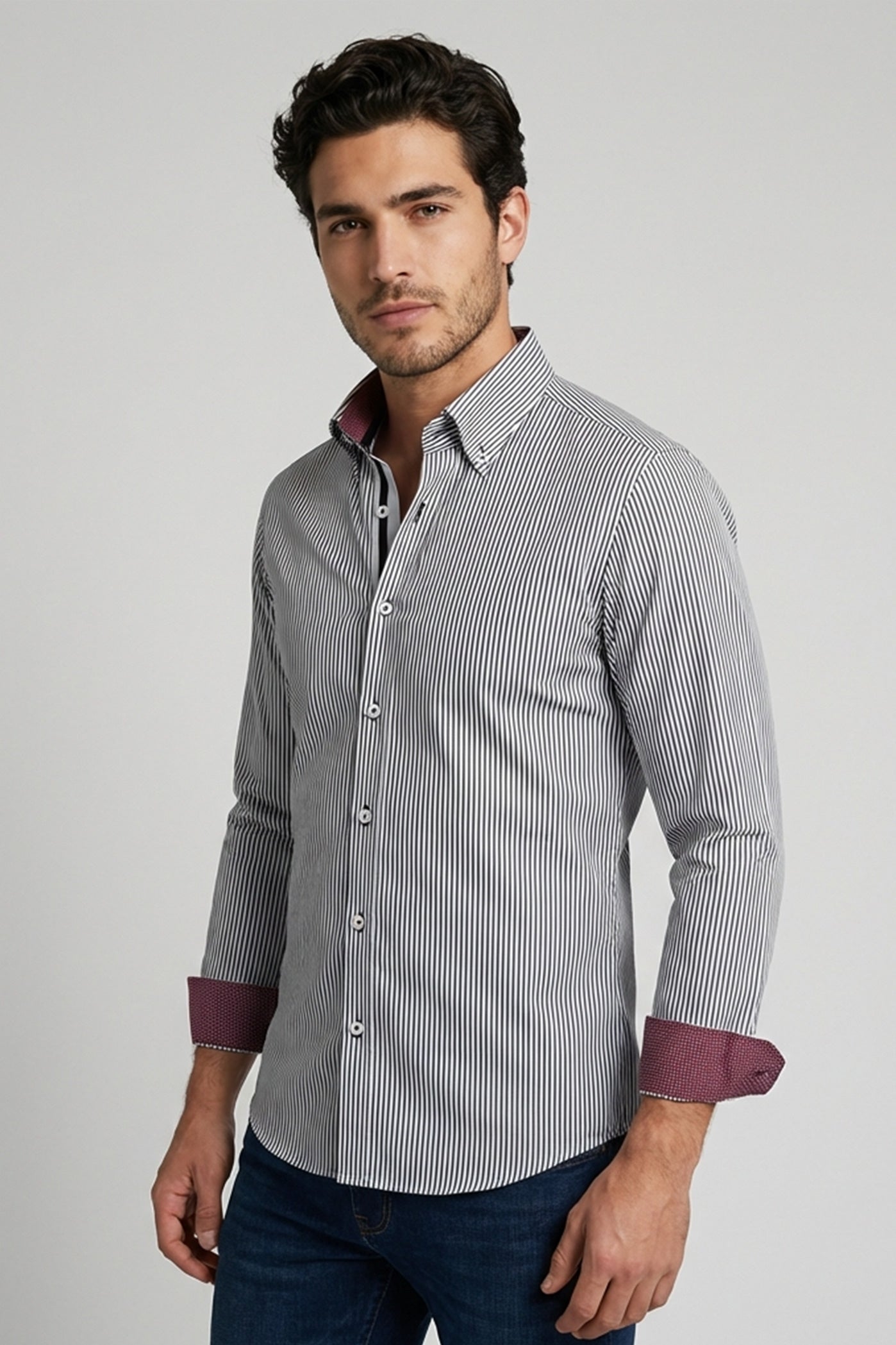 Descripción del producto: Descubre la elegancia y el confort de nuestra camisa para hombre, diseóada especialmente para quienes buscan un look moderno y sofisticado. Con su cuello button down y una vestibilidad slim fit, esta camisa se adapta perfectamente a tu silueta, proporcionando un ajuste elegante y cómodo. Fabricada en popelín, su textura suave garantiza una sensación agradable sobre la piel, mientras que el diseóo de rayas medianas aporta un toque distintivo. Ideal para combinar con jeans o pantalones formales, es la prenda versátil que necesitas en tu armario.