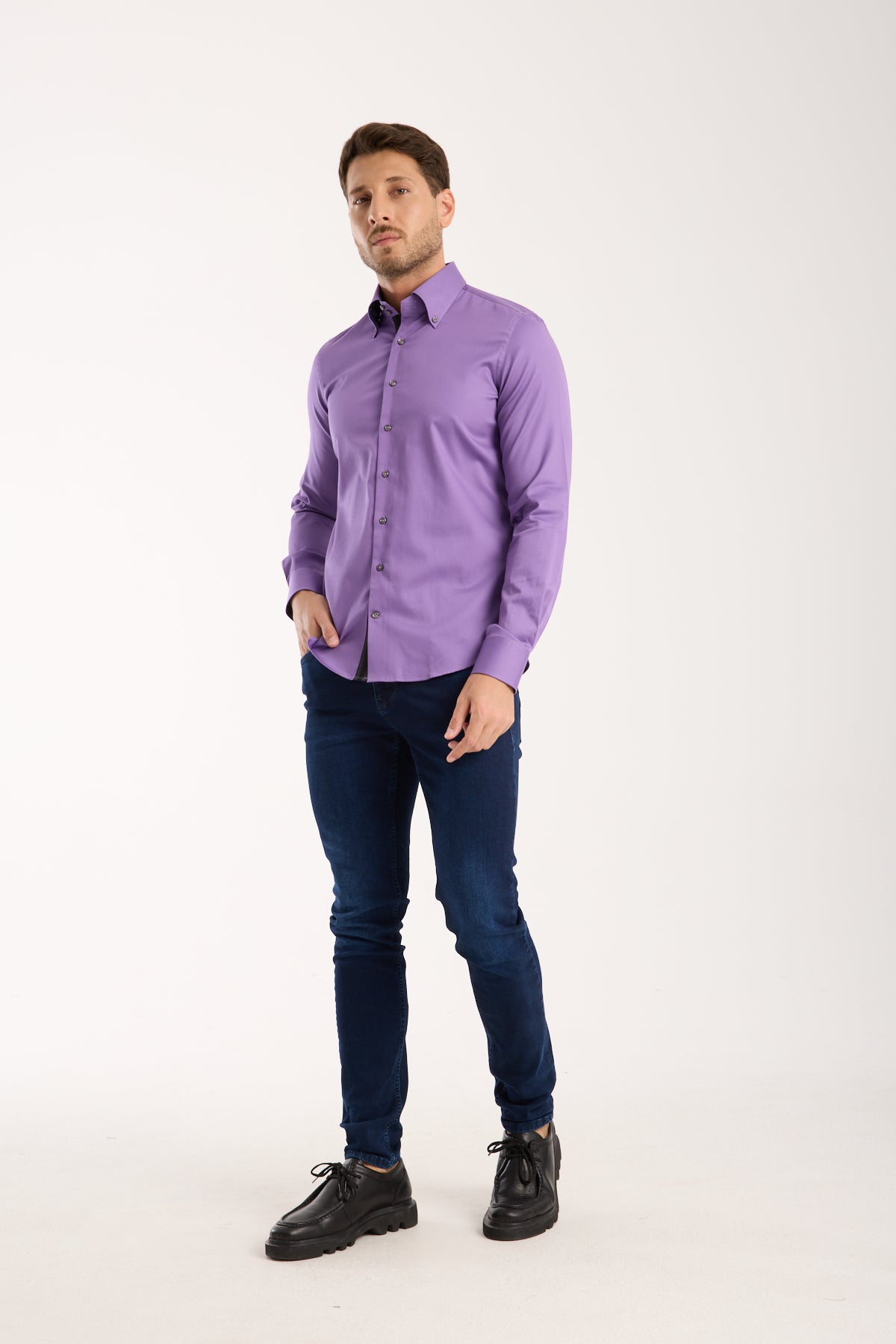 Notre chemise pour homme se distingue par son col boutonné qui ajoute une touche de sophistication. Fabriquée en satin, elle offre une texture douce et élégante qui se drape parfaitement sur le corps. La coupe slim fit met en valeur la silhouette tout en garantissant un confort optimal. Avec ses manches longues et son motif uni, cette chemise est un incontournable de la garde-robe masculine, disponible dans une jolie teinte violette.