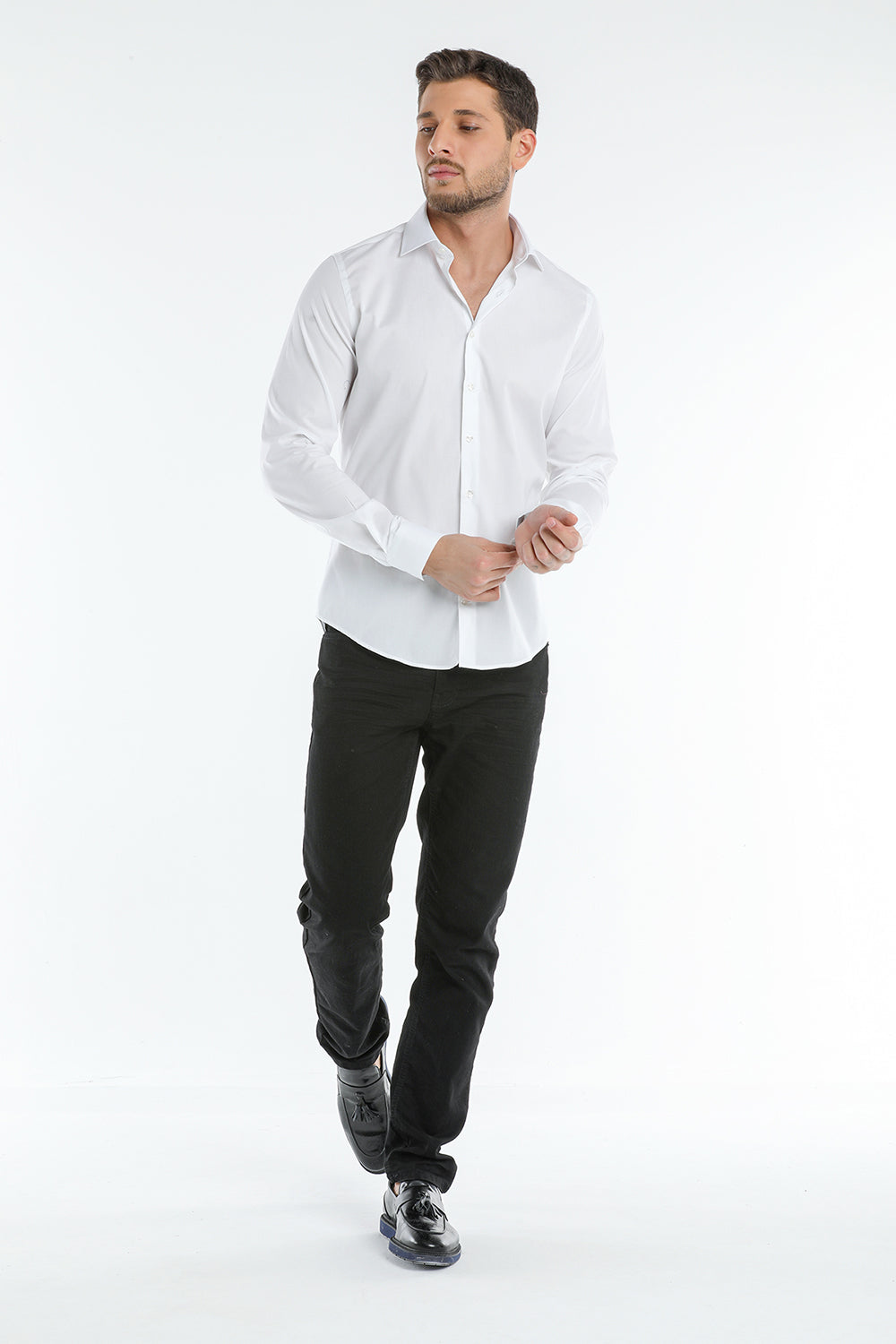Cette chemise pour hommes possède un col français classique, idéale pour un look à la fois formel et décontracté. Le fit slim met en valeur la silhouette tout en offrant un confort optimal gr+óce à son tissu en popeline stretch. Avec ses manches longues et son design uni, cette pièce essentielle est facile à associer avec n'importe quel pantalon. Le coloris intemporel et élégant s'adapte à toutes les occasions.