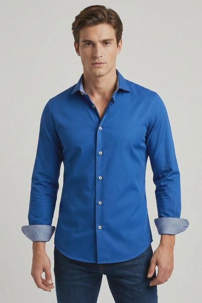 La chemise est dotée d'une coupe slim fit qui met en valeur votre silhouette. Les manches longues et le tissu doux au toucher garantissent une sensation de bien-+¬tre tout au long de la journée. La combinaison du bleu vibrant et des détails contrastants à l'intérieur du col ajoute une touche de modernité et de style.