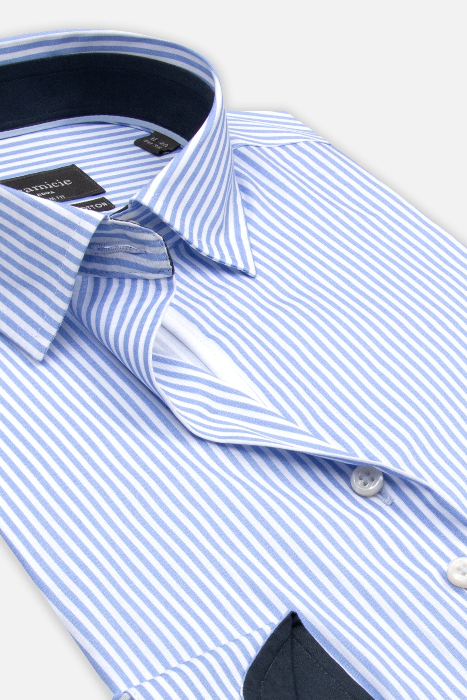 Cette chemise pour femmes possède un col italien, parfait pour un look chic et raffiné. Profitez d'une coupe slim fit qui épouse vos formes sans compromettre le confort. Les manches longues ajoutent une touche de sophistication, tandis que les rayures fines et élégantes apportent une note moderne à cette pièce classique. Disponible dans un joli coloris bleu, cette chemise est confectionnée en popeline stretch, un tissu léger et respirant idéal pour toutes les saisons.