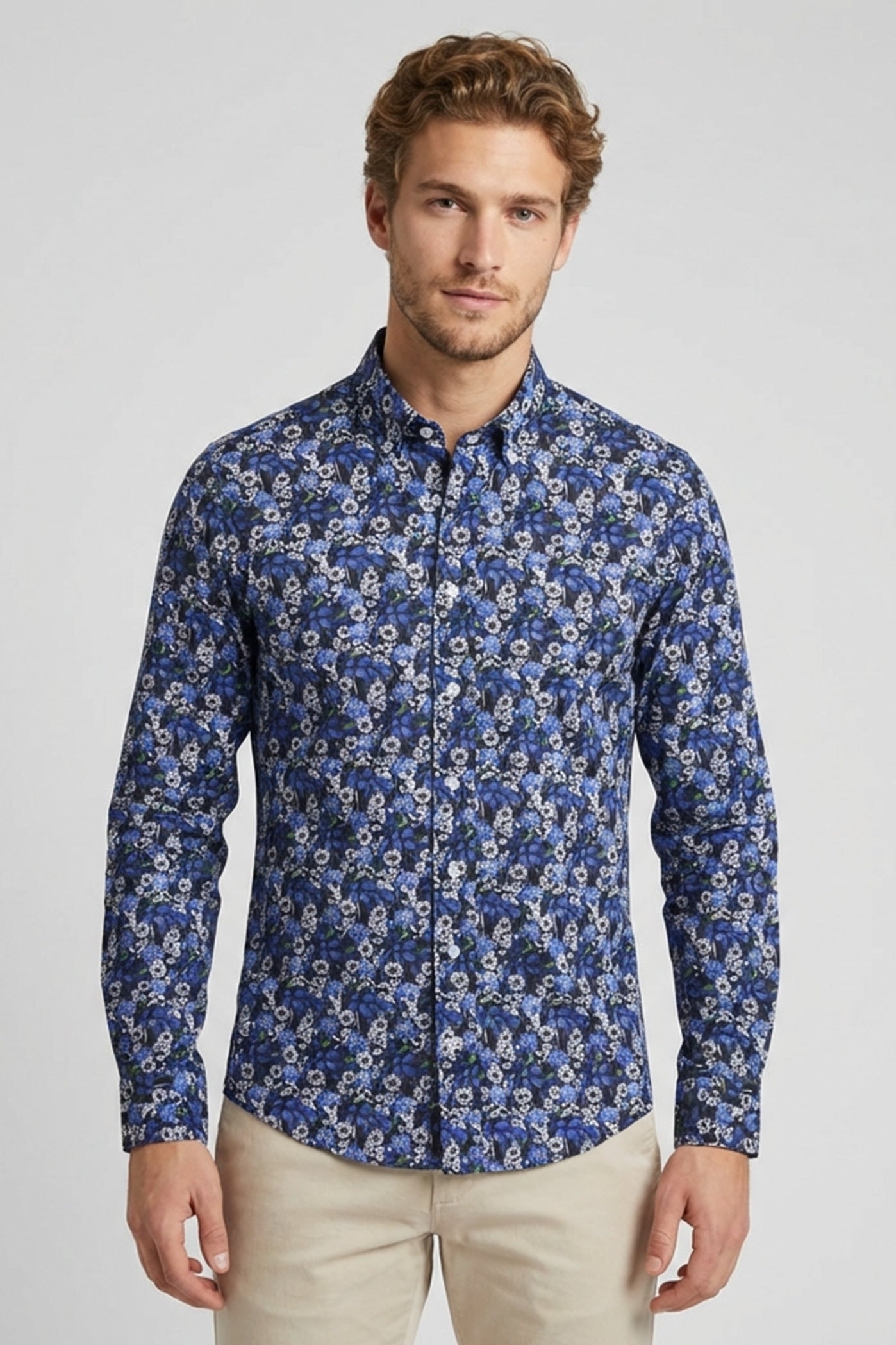 Realizzata in comodo popeline di cotone con un design a fantasia blu, questa camicia da uomo con collo button down garantisce un look senza tempo ideale sia in ufficio che per occasioni casual. Il colletto button down consente uno stile versatile adatto a ogni occasione.