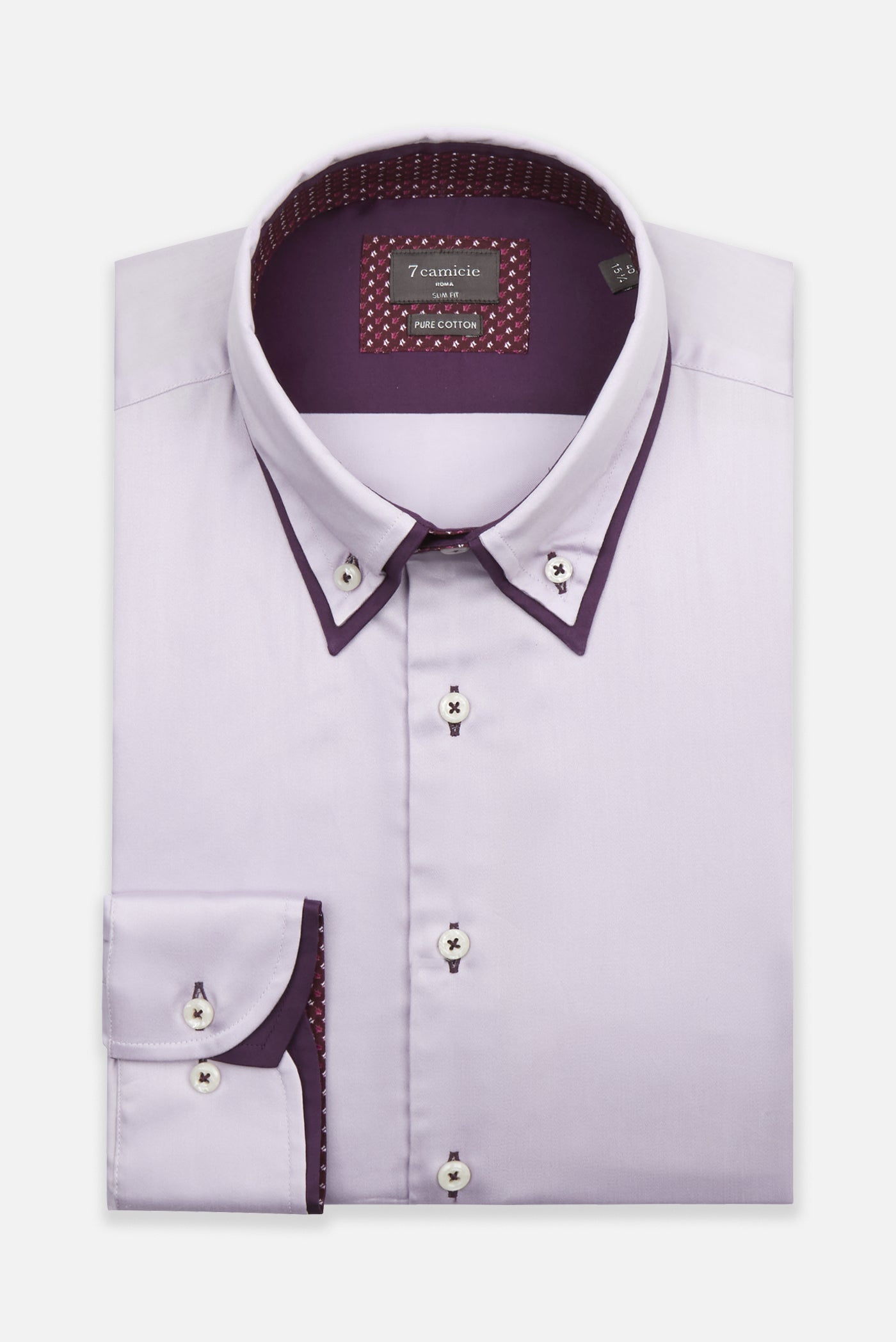 La camicia presenta una vestibilità slim, adatta per esaltare la silhouette maschile senza sacrificare la comodità. Il design è plain, rendendola versatile per abbinamenti con pantaloni eleganti o jeans. I maniche lunghe offrono protezione e stile, mentre l'interno del colletto e dei polsini, in un contrasto di colori eleganti, conferisce un tocco di originalità. Disponibile in una delicata tonalità di lilla, si adatta perfettamente a ogni stagione.