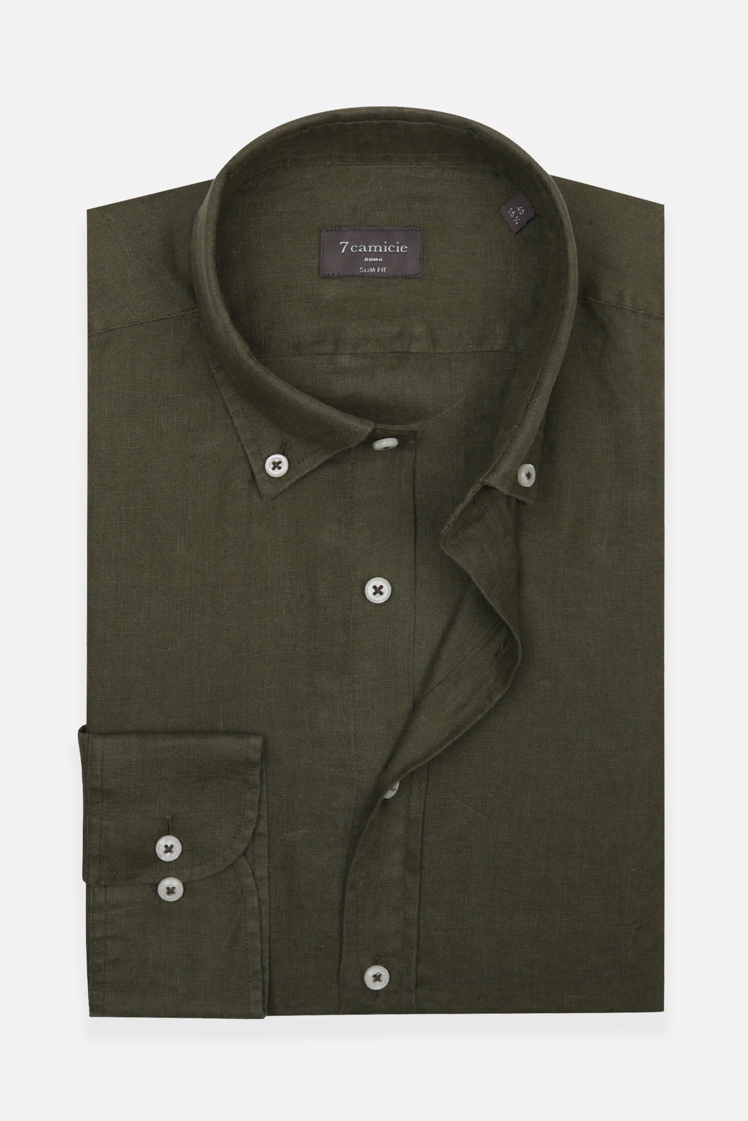 La camicia presenta un colletto button down che conferisce un look strutturato e raffinato. Realizzata in tessuto di lino, offre una vestibilità slim fit, perfetta per valorizzare la silhouette maschile. I maniche lunghe e il design semplice e senza stampe rendono questa camicia versatile, adatta per ogni occasione, dal lavoro agli eventi informali. Il colore verde oliva aggiunge un tocco di originalità, rendendola facilmente abbinabile a molti completi.