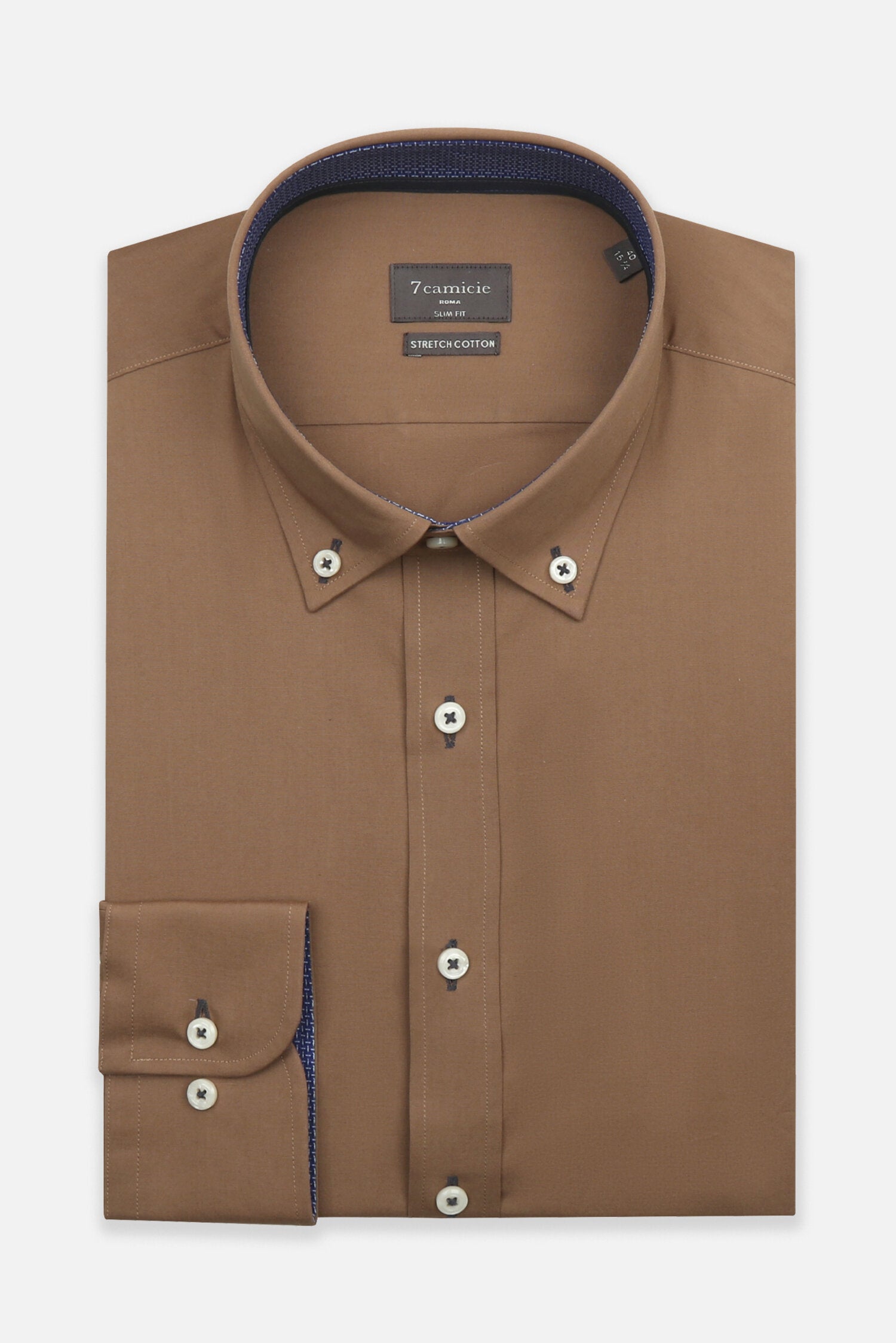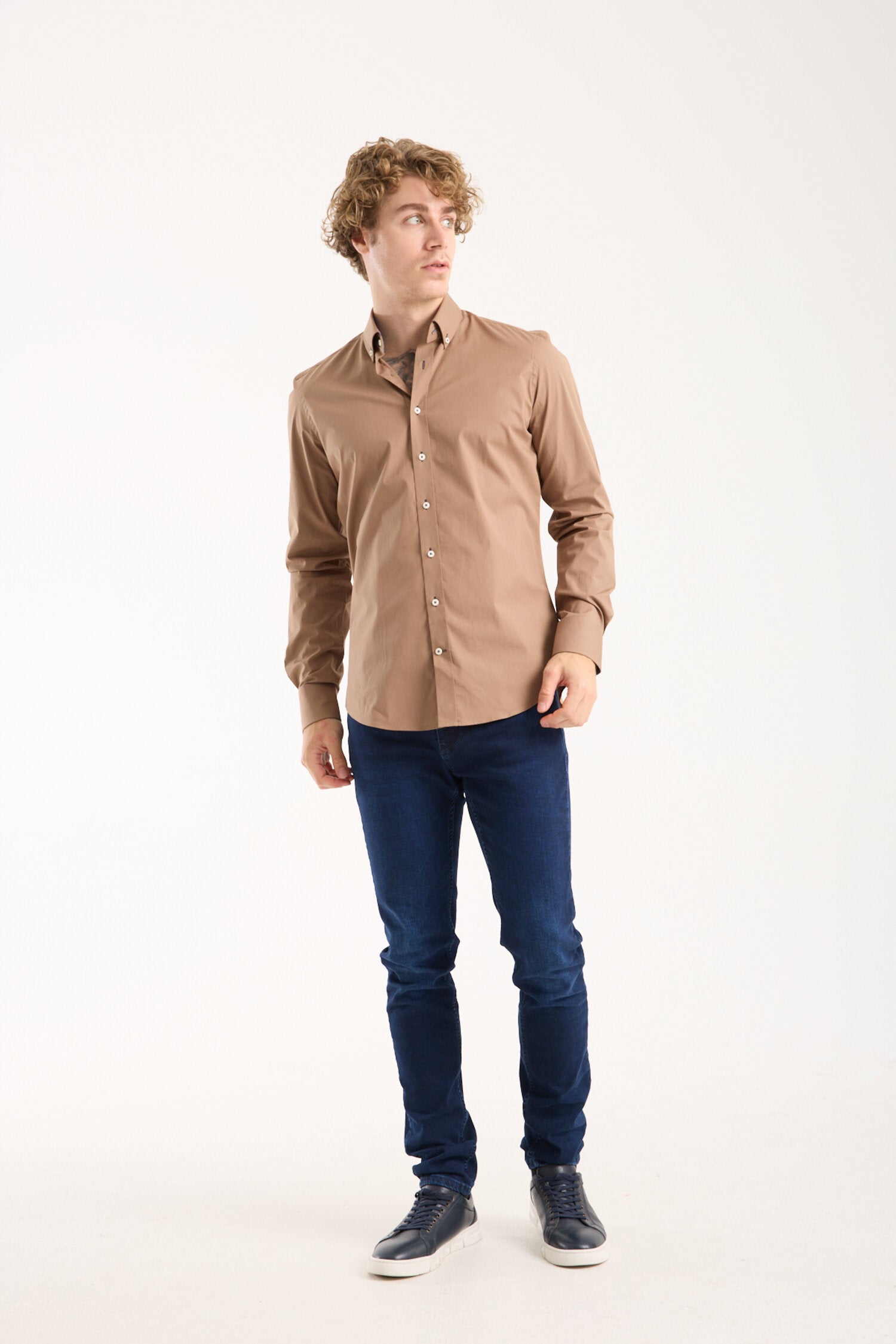 This shirt features a classic button-down collar and a slim fit that contours to your body, offering a tailored appearance without sacrificing comfort. Made from high-quality poplin stretch fabric, it ensures flexibility and ease of movement. The long sleeves provide versatility for any season, while the plain pattern allows for easy pairing with your favorite trousers or jeans. Available in a rich brown color, this shirt is perfect for adding a touch of warmth to your wardrobe.