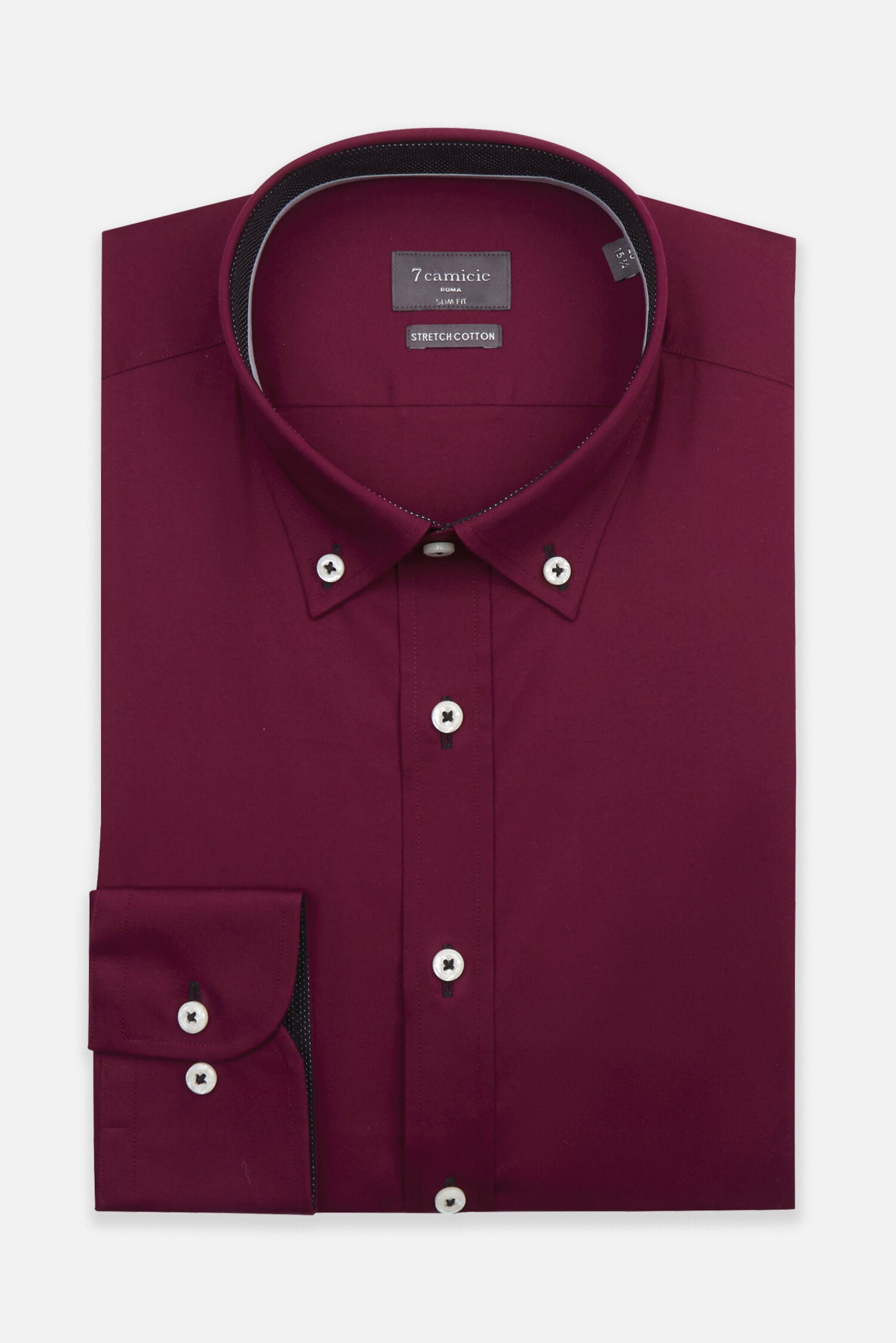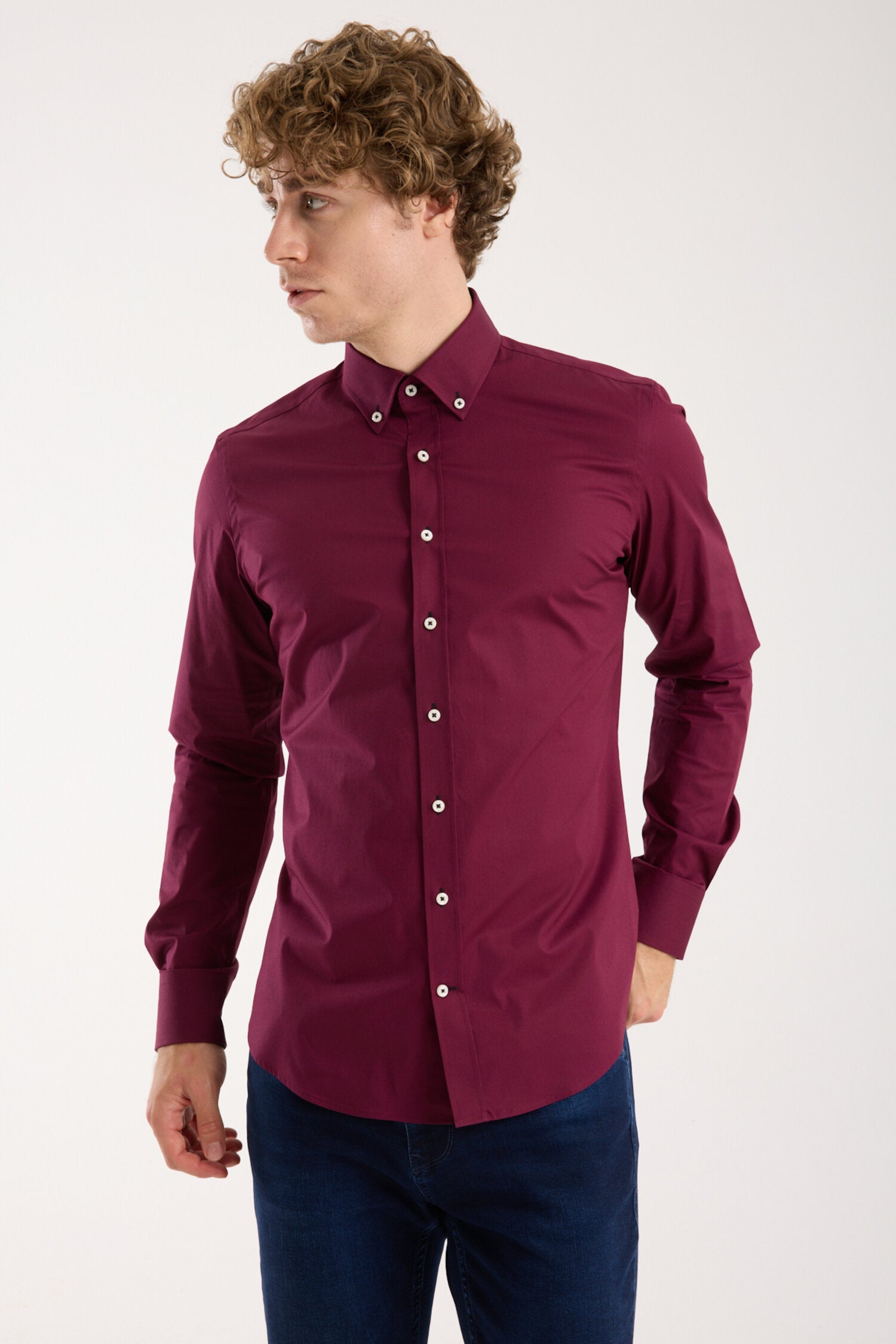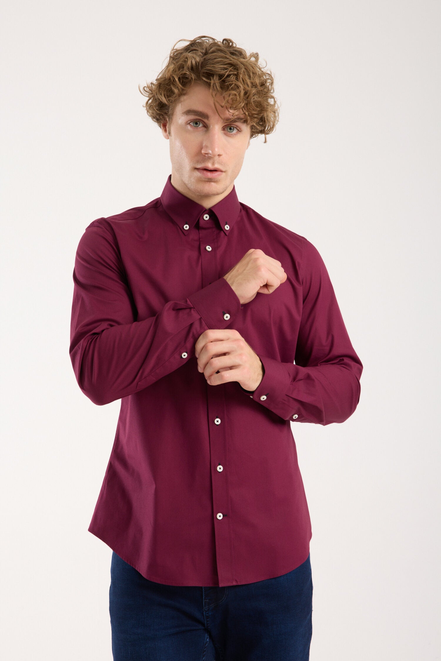 Discover the perfect combination of comfort and style with our men's Slim Fit Poplin Stretch Shirt. Designed for the modern man, this shirt is the epitome of effortless elegance, featuring a versatile button-down collar and a rich burgundy hue that stands out in any setting.